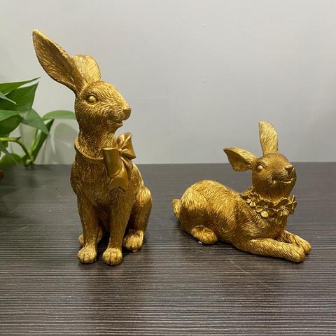 Pièces de décoration saisonnière personnalisée pour les fêtes Figurine de lapin doré en résine Ensembles de deux lapins de Pâques